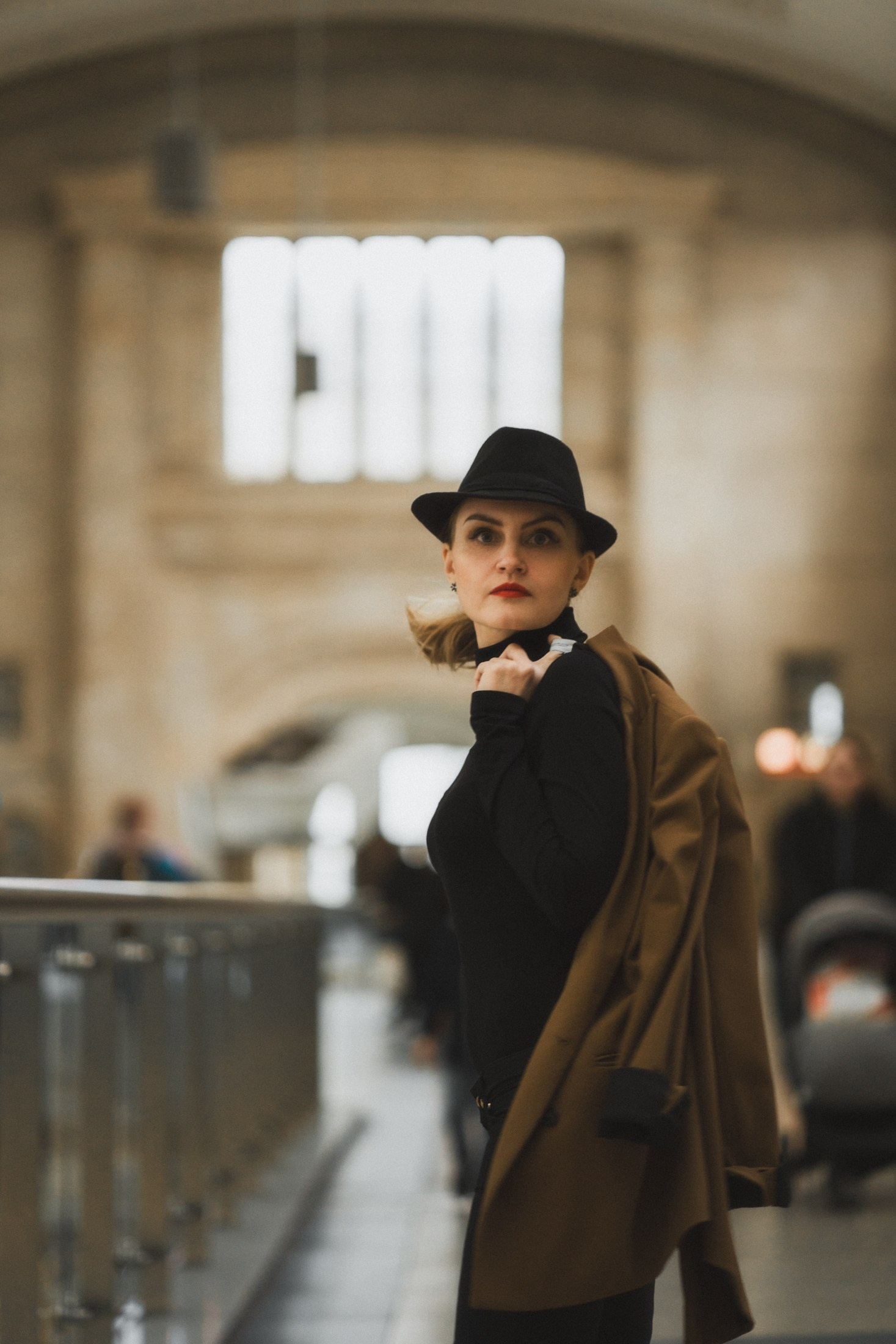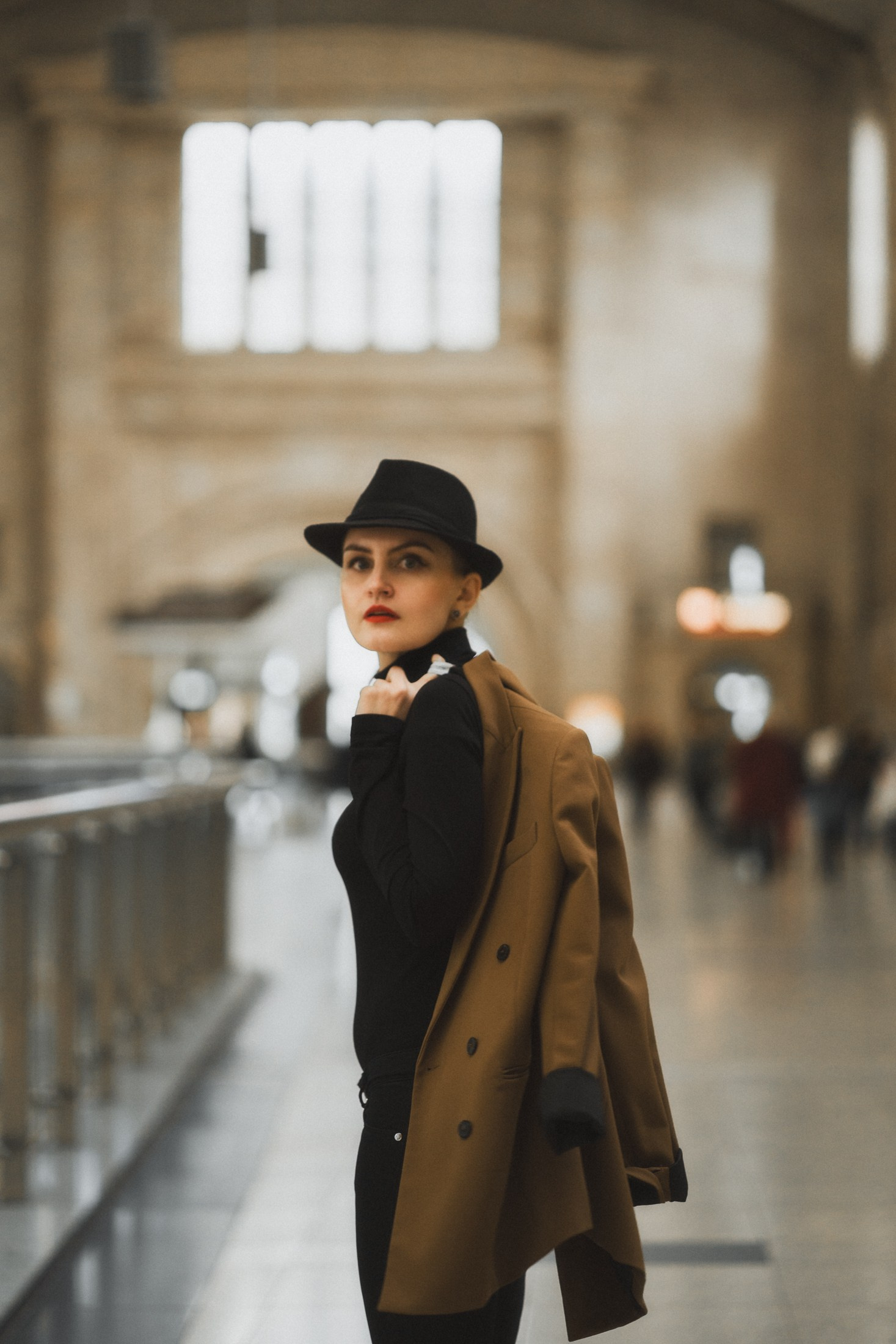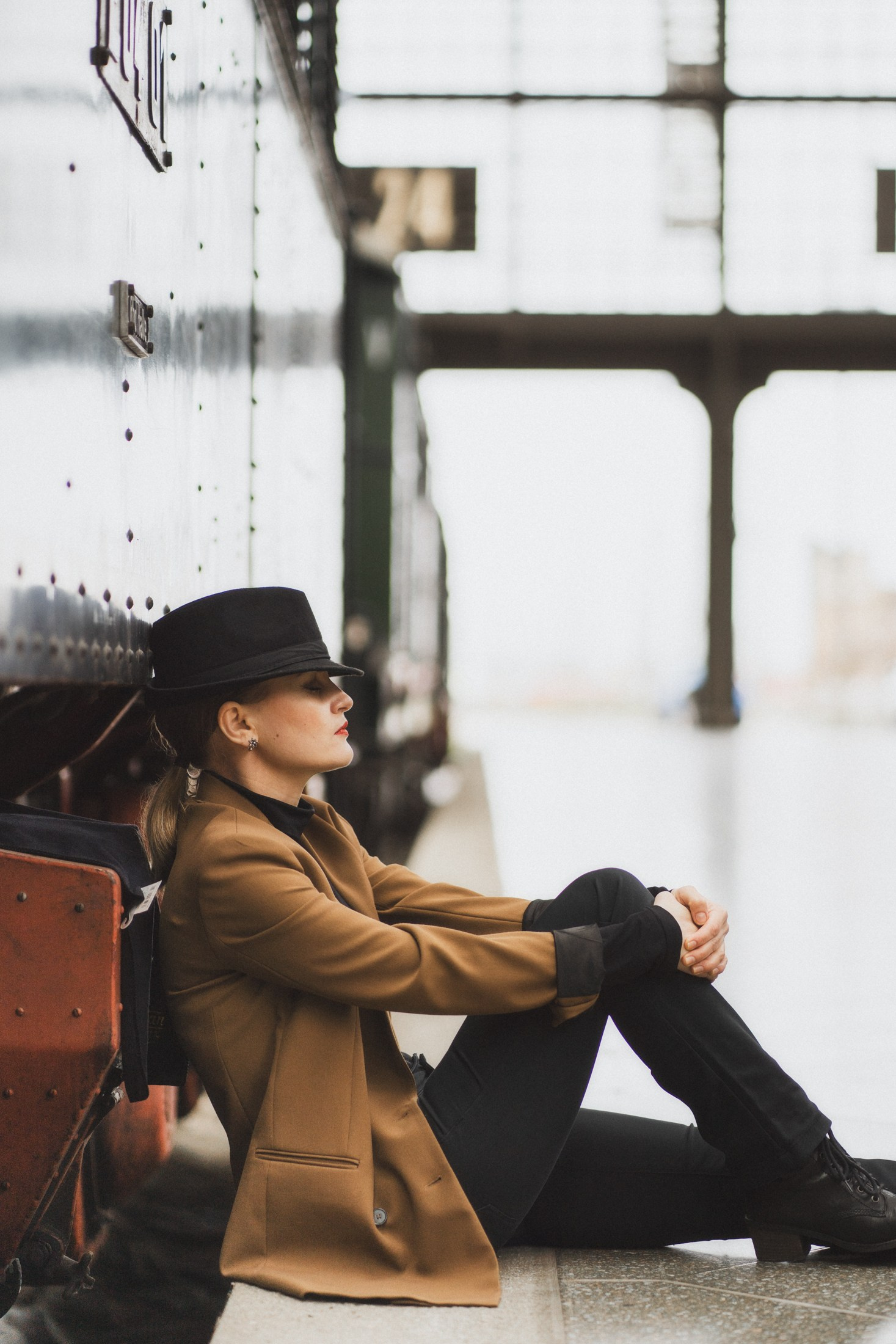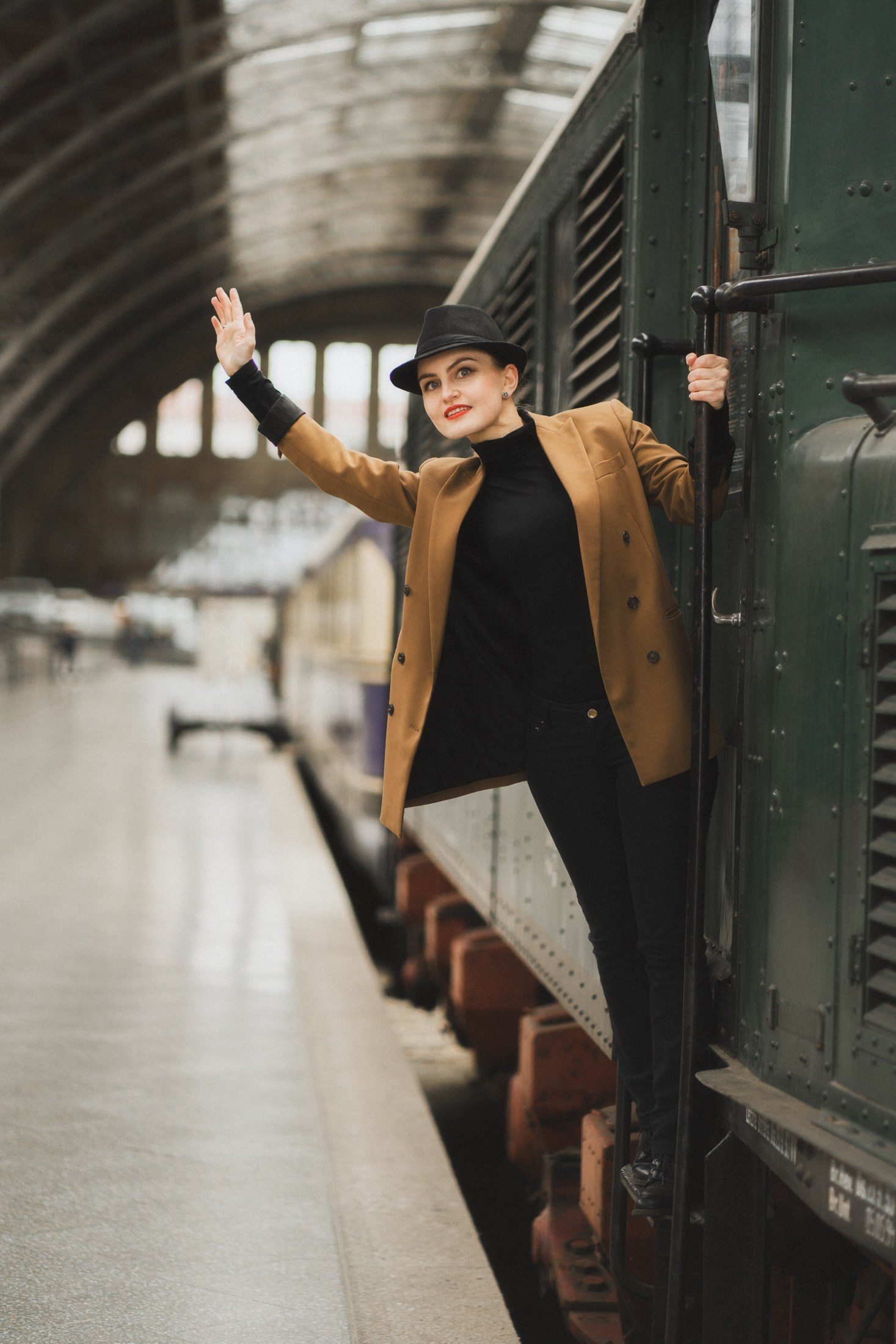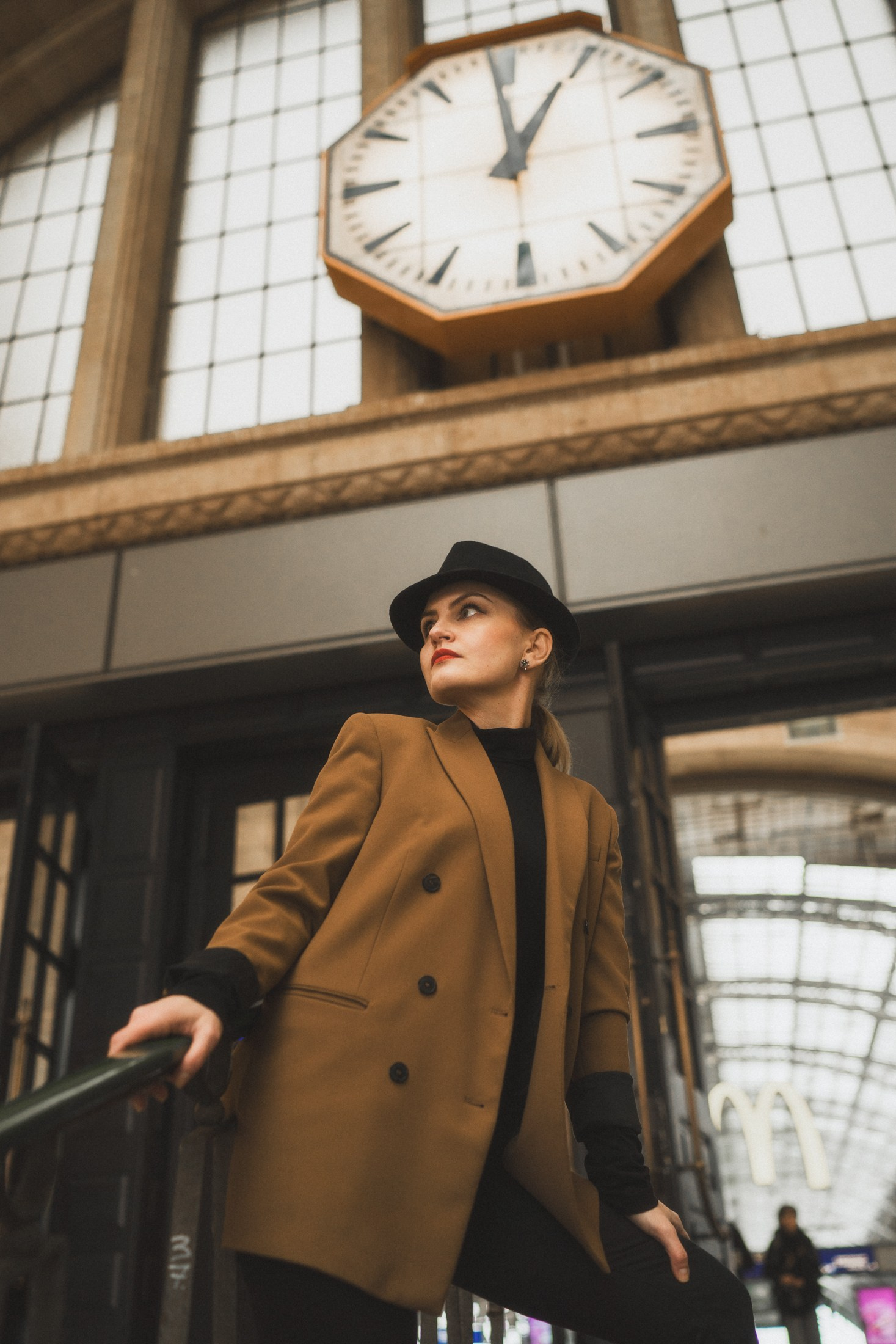 Cineastische Portraitserie mit Lydia am Leipziger Bahnhof – elegante Retro-Atmosphäre und Reisegefühl